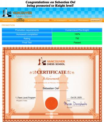 Vancouver Chess School is an absolutely wonderful school for kids. Moving up from lower level class (Pawn) to higher ones ( Bishop) is a good way to build children’s motivation. All coaches and staf...